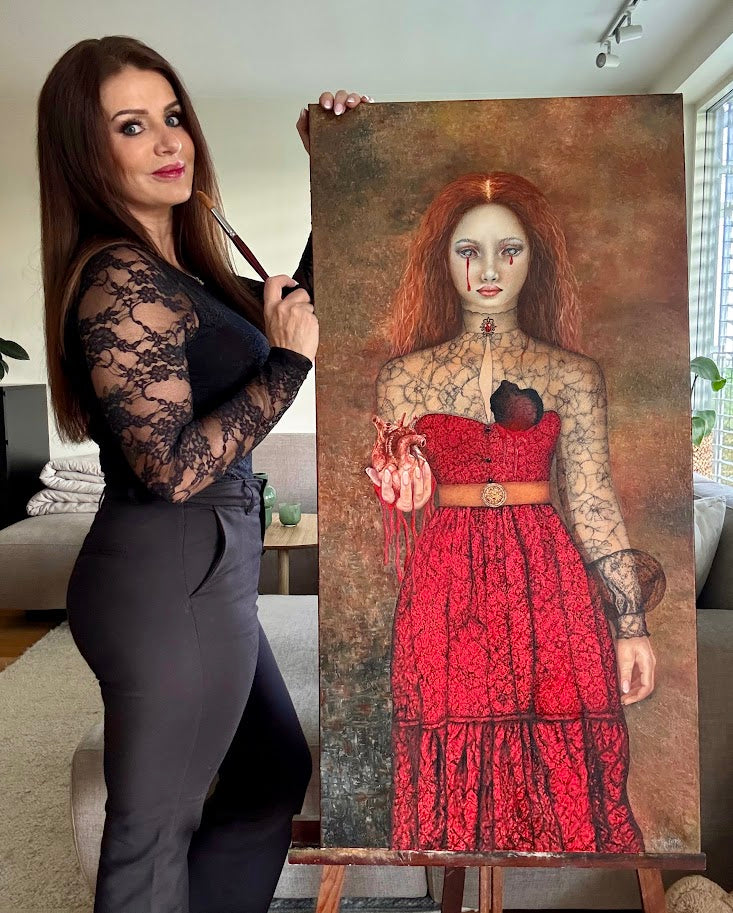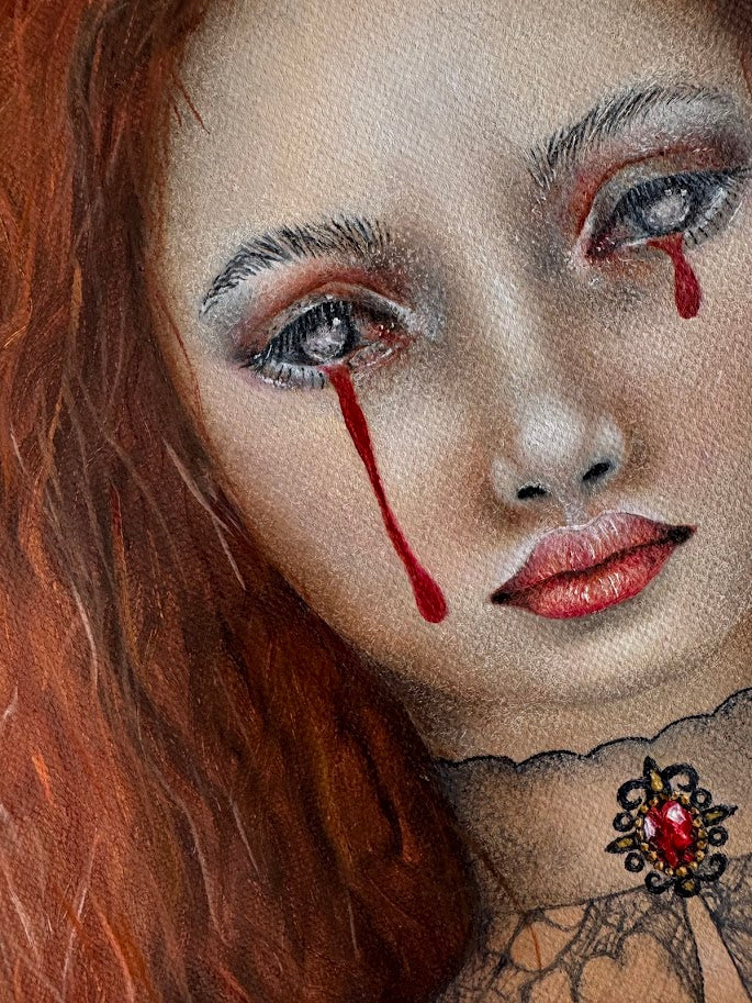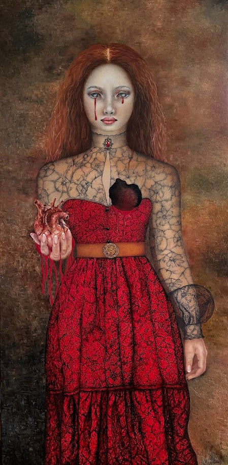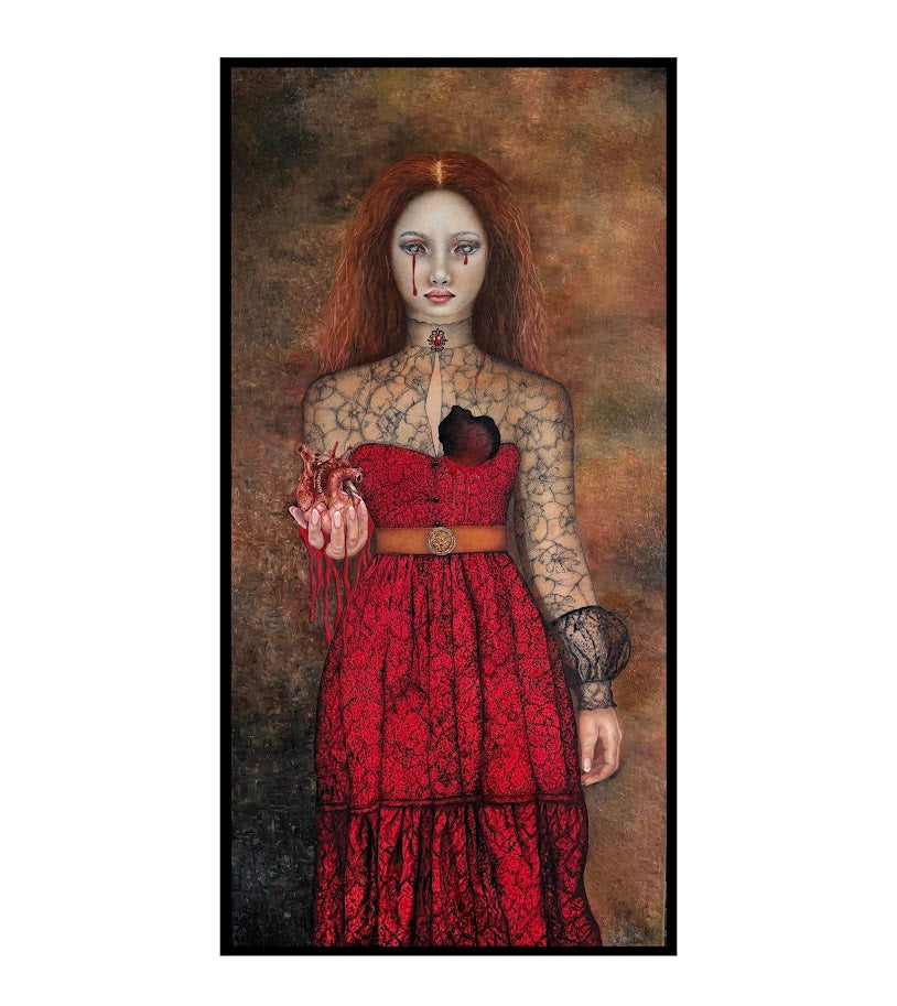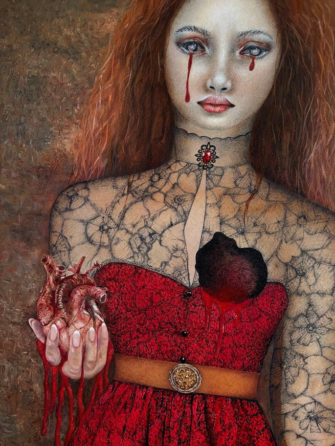 Hun står med hjerte i hånden og vil gi alt, hele seg selv. Men hennes tomme blikk og tårer av blod forteller om hennes smerte og tap. Dette speiler følelsen av å ville gi alt i kjærlighet, men bli møtt med kynisme, overfladiske intensjoner eller utnyttelse. En refleksjon om hvordan ekte kjærlighet kan føles sjelden i en tid preget av kortvarige forbindelser og egoistiske ønsker.