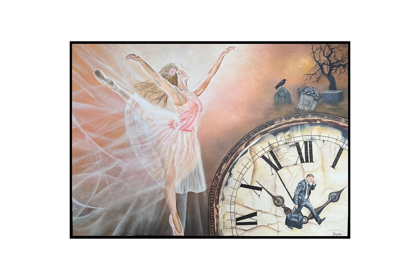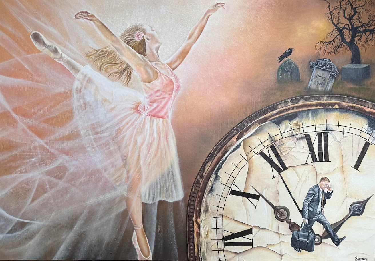 Dette maleriet fikk navnet "Tiden". Bildet for meg er en påminnelse om å glede seg over livet hvert minutt, være fri og seg selv. Ikke la livets utfordringer og bekymringer gjøre livet tungt og trist. Lev mens du lever.